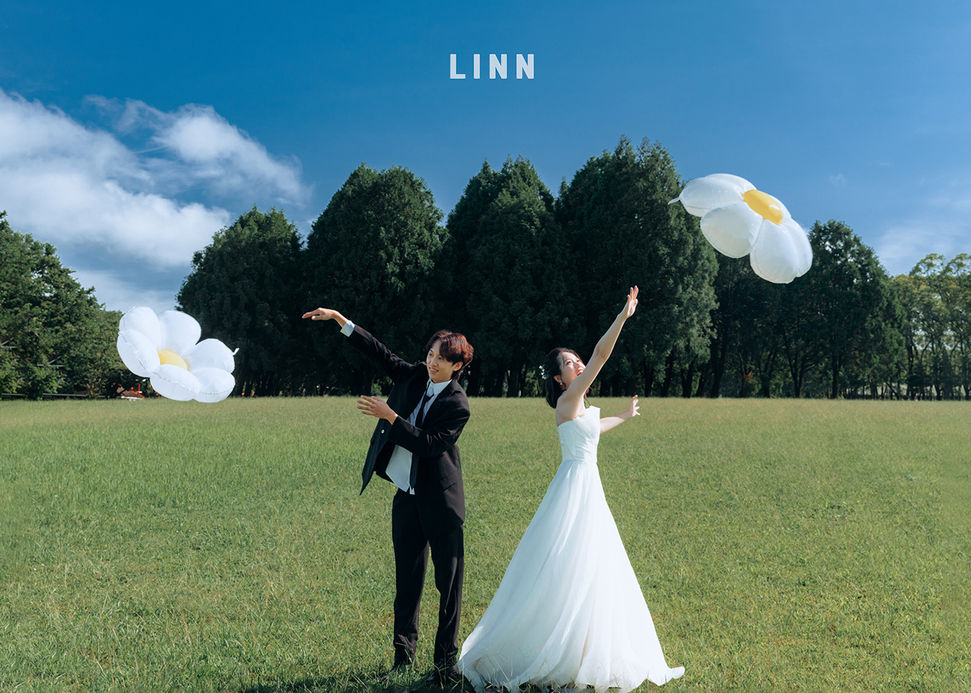 這對嚮往藍天、白雲、綠地的新人,原定行程是中午先在攝影棚拍攝,下午再前往南投外拍。然而,看著捉摸不定的天氣預報,為了守護心中那份「自在活潑」的戶外憧憬,我們在拍攝前一天決定大膽對調行程——趁著陽光最好的上午,搶先直奔南投。